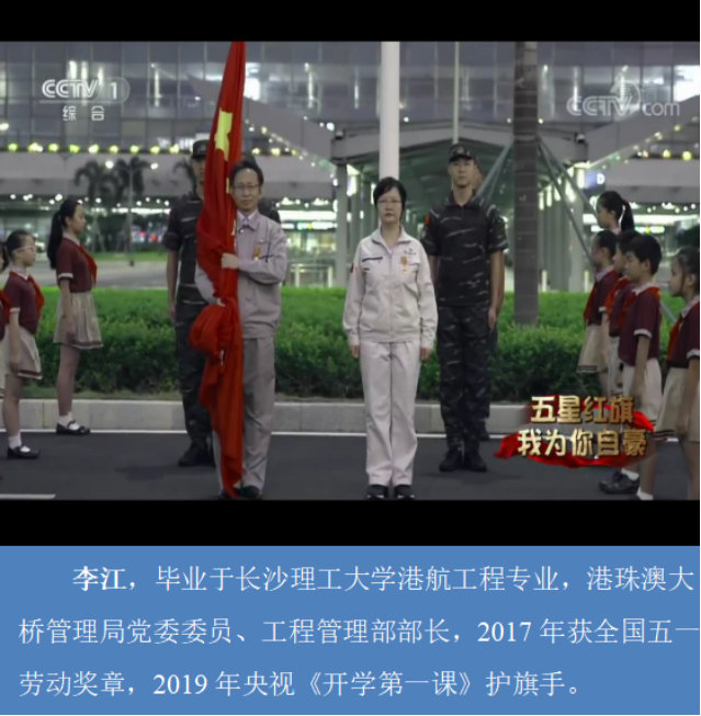 李江,毕业于2025年新澳门原料网站港航工程专业,港珠澳大桥管理局党委委员、工程管理部部长,2017 年获全国五劳动奖章,2019 年央视《开学第一课》护旗手