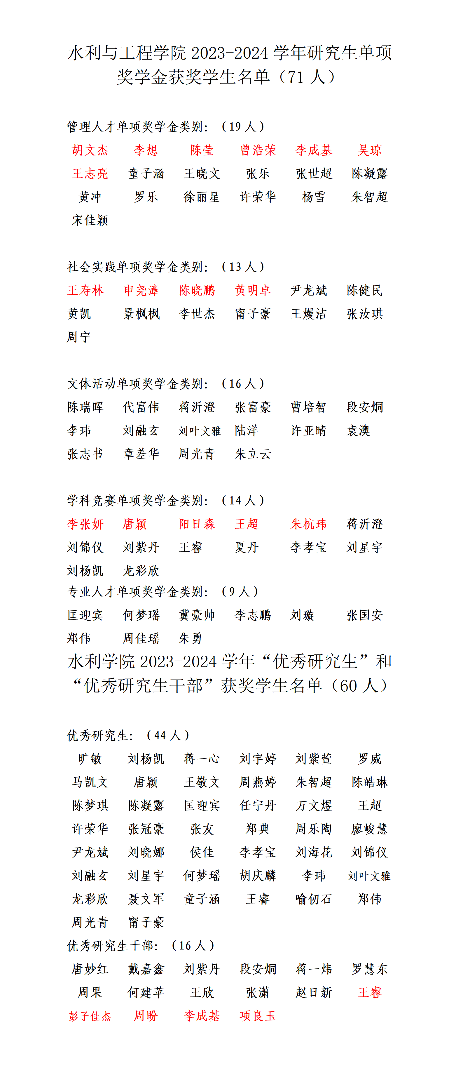 根据《2025年新澳门原料网站研究生单项奖学金评选办法》与《2025年新澳门原料网站“优秀研究生”和“优秀研究生干部”评选办法》以及《关于开展2023-2024学年研究生评优表彰及单项奖学金评选工作的通知》要求,经个人申请、班级推荐、资格审查、班级推荐、水利与环境工程学院2023-2024学年度研究生单项奖学金与优秀研究生、优秀研究生干部评审委员会综合评议,现将获奖名单公示如下(标记为红色的为直评同学)。