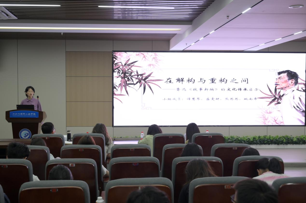 文新学院的盛雯妍等用PPT展示《故事新编》,重点汇报著作内容、创新特点、时代精神,图文并茂的分享了鲁迅创作的奇思妙想和中华文化的博大精深。中国语言文学学硕24级谭慧琴表示:“这次分享会,我们团队重在传达作品的创新性和作者的创作性,我们看到了鲁迅将个人的生命体验与时代的精神价值铸成‘新编’,也看到了与传统认知中大爱无私的英雄形象不同的认知,希望借《故事新编》作品,给大家对文化传承带来一点启发。”