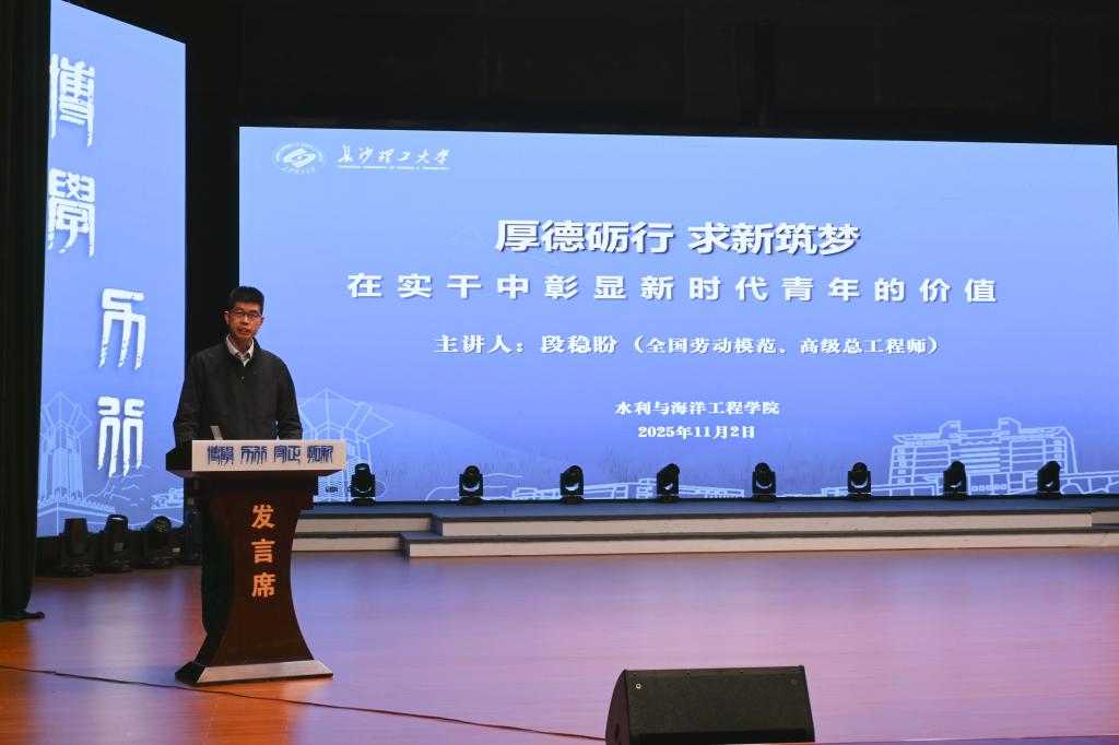 在讲坛中,全国劳动模范段稳盼以“厚德砺行 求新筑梦:在实干中彰显新时代青年的价值”为题,结合18年扎根一线的工程实践,分享了五个职业生涯关键片段。在曹妃甸煤码头,他从“迷茫”到“沉心”,领悟到“将手头最不起眼的小事做到极致,是伟大事业的真正起点”,勉励同学们“干一行爱一行”,从基层做起,筑牢职业根基。在四川深山修建兰渝铁路,他将理论知识转化为提升工程质量的实践武器,钢筋保护层合格率提升20%,混凝土缺陷率下降10%,展现了“钻一行精一行”的工匠精神。在柬埔寨雷区修建55号公路,他带领团队攻克特殊水文地质难题,首次采用“装配式锚杆挡土墙”等创新工艺,输出“中国标准”,诠释了新时代青年的国际担当。在甘肃东乡,他带领党员突击队修路筑渠,助力脱贫攻坚,践行“人民对美好生活的向往就是我们的奋斗目标”,将为民情怀融入工程建设。在新疆木垒,他迎战极寒与无路之境,建成国内单体最大山地风电场,为国家“双碳”战略贡献智慧,展现了开拓突破的创新勇气。
