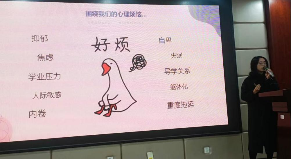 为加强研究生心理健康教育,帮助学生缓解心理压力、提升心理调适能力,12月23日下午,食品学院在工科三号楼A320举办研究生心理健康讲座。本次讲座由学校心理健康教育中心卢灵舢老师主讲,研究生辅导员祝孟豪及2025级全体研究生参加。