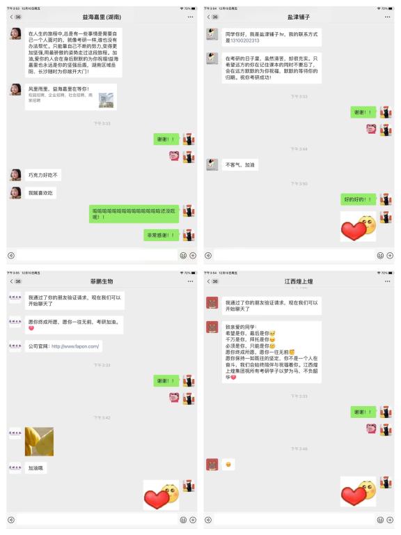 此次活动得到了用人单位的积极响应和大力支持,纷纷表示是针对当前毕业生招聘痛点的一次不错的尝试。考研学子们现场反馈热烈,考研紧张情绪得到释放的同时,纷纷积极与用人单位微信互动,建立联系。
