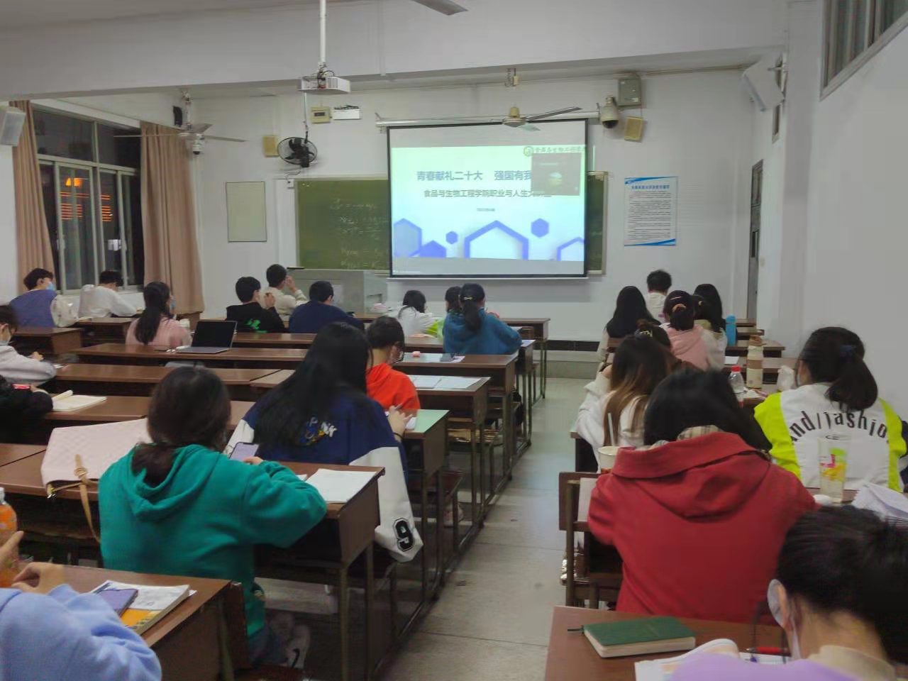 为进一步加强学院学生职业认知能力和规划水平,帮助学生认识专业及未来发展,树立正确的求职目标,4月4日晚19:30,食品学院以线上形式举行了以“青春献礼二十大,强国有我新征程”为主题的职业与人生大讲堂活动,此次活动由就业辅导员兰贵辉主持,学院2014级优秀校友刘涛作为嘉宾进行了专题分享,学院2021级新生在自习教室集体观看,其他年级学生及研究生自主线上参与,共计近400人参加。