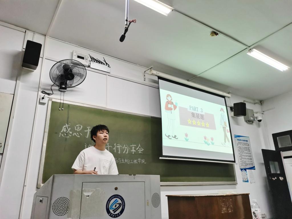 本次分享会首先由2名国家励志奖学金获得者为全体同学分享学习、生活等各方面的经验。生物1801班朱帆主要从学业规划、学习经验、科研经验三个方面进行分享,他建议同学们积极参与到科技赛事中来,他说主动才会有故事,要主动联系导师和学长学姐。食品1801班张银焕则以“心向阳光,行向远方”为主题,为同学们分享专业学习、学生工作、社会实践的建议,她谈到现阶段当大家对未来感到迷茫焦虑时,那就先做好当下该做的事情。