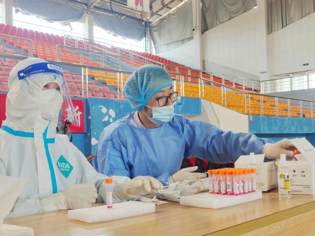 图10 熊英老师在体育馆参加核酸检测志愿者工作