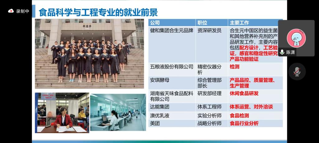 校友袁清龙目前担任湖南中雅国际食品有限公司董事长,湖南荟鲜森食品科技有限公司总经理职务。他以“热爱,坚持”为题,与同学们分享如何进行职业选择,同时还分享了在食品领域成功的其他校友。