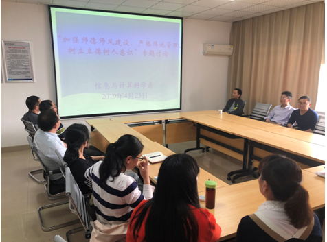 4月23日下午,数统学院信息与计算科学系在理科楼A502开展了“加强师德师风建设,严格阵地管理,树立立德树人意识”的专题学习活动。学院主管本科教学工作的龚红仿副院长和仝青山副院长出席活动并进行指导。