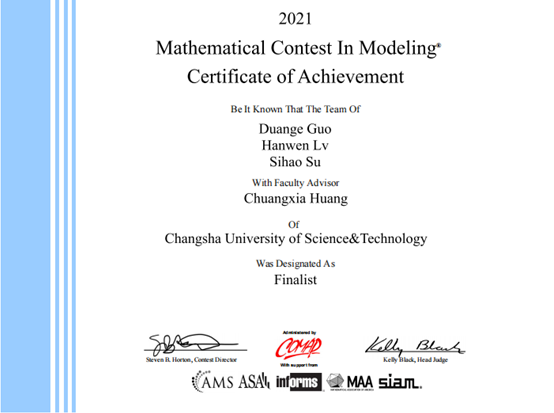 近日,2021年美国大学生数学建模竞赛结果正式公布。我校共获得特等奖提名奖(Finalist)1项和二等奖(Honorable Mention)6项的好成绩。数学与统计学院黄创霞教授指导的郭端格、吕翰文、苏思浩3名同学组成的代表队获得此次竞赛的特等奖提名奖, 实现了学校在此项比赛上的突破。