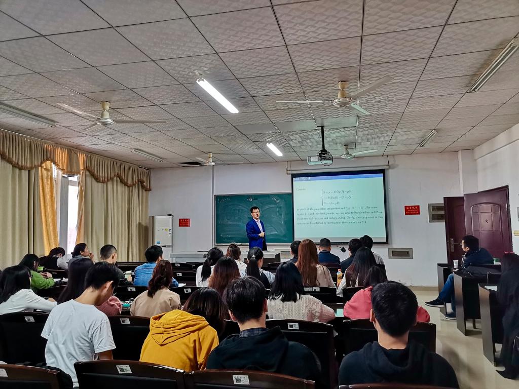 1020日周二上午930,在理科楼A-419举行了林国教授题为 Spreading Speeds of Epidemic Models with Nonlocal Delays”的学术报告。此次报告由数学与统计学院院长黄创霞老师主持,各年级研究生都积极参加了此次报告会。