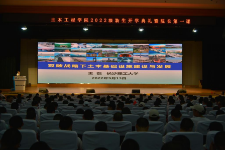 典礼结束后,院长王磊教授以“双碳战略下土木基础设施建设与发展”为题,给全体2022级新生带来“院长第一课”。王磊教授从“土木基础设施建设成就,土木基础设施碳排放,土木基础设施建造成本,土木基础设施未来发展”四个方面讲授,通过运用大量实例,围绕“土木工程发展历程、破解基础设施建设难题、我国土木基础设施建设存在的问题、‘双碳’战略目标提出、‘十四五’建设现代化基础设施体系”等热点问题展开授课;他指出“近40年我国基础设施发展迅猛,公路总里程居世界第一,为第2-6名的总和;市政地铁总里程稳居世界首位;房屋建筑行业的发展支撑我国城市化进程基础设施建养过程中能耗和碳排放在全行业和全社会的碳排放中均占比较大,降低碳排量对实现‘双碳’ 目标有重要影响,应大力推进建养绿色化技术基础设施造价高、投资大,在我国经济发展中占较大比重,基础设施投资呈逐年上升趋势,约占GDP的30~50%基础设施建设正向海洋、西部艰险地区发展,一大批重大重点工程即将建设。”
