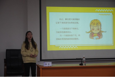 学生代表周彤从阅读和文学赏析的角度分享了《外婆的道歉信》一书的私人阅读札记,该书非常规的人物形象——古怪又疯狂的外婆、扣人心弦的故事情节、克制的动作背后克制的感情深深吸引了她。她谈到,无论是漫无目的的阅读,或是追求回报的阅读,还是轻松享受的阅读,都是我们在不断地阅读中,感受自我人生状态的变化,体会自身成长的过程。她的分享让大家对文学作品的赏析有了新的理解,也让拓宽了大家的阅读广度。