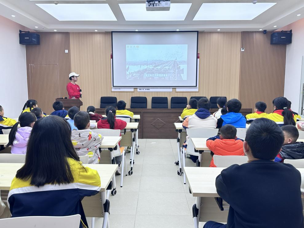 透过生动的图片与精彩的视频,宣讲团成员周舟通过建桥背后中苏的友好合作以及此桥在南北连接中发挥的重要作用,对武汉长江大桥进行了简单介绍。在与老师的问答互动过程中,同学们积极主动,观点新颖,了解到了大桥的基本组成与构建方式。“万里长江横渡,九洲风雨同舟……”,周舟由毛泽东主席在建桥故事中三次畅游长江,视察大桥的作为,引出了一首关于武汉长江大桥的诗篇,他带领着同学们齐声朗读,缅怀伟人,坚定红色信念,厚植家国情怀。接着,宣讲团成员王梦楠带着同学们了解了建桥过程中伟人们刻苦钻研,孜孜不倦的钉子精神,鼓励同学们传承红色文化,发扬进取精神。