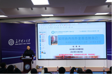 杜荣华以“如何由内向外全面造就自己”为主题,分享了《高效能人士的七个习惯》一书。杜荣华和师生们共同探讨“什么是习惯?什么是原则?什么是思维模式?”同时,他还分享了自己对这本书中所提出的七个习惯“积极主动、以终为始、要事第一、双赢思维、知彼解己、综合统效、不断更新”的理解和实践经验。杜荣华强调内在的改变和修炼对于个人成长的重要性,认为只有从内向外全面地造就自己,才能真正成为一个高效能的人。