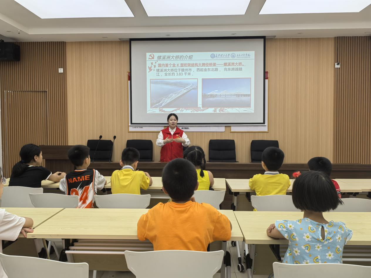 建筑工程党支部宣讲团成员郑珍透过图片的剪影,向同学们生动讲述了武阳桥在长征过程中的重要作用和惊险故事,让同学们感受到了红军长征的艰辛和勇敢。她强调,在艰难的抗战条件下,桥梁虽简,但有工匠师傅们倾心加固、青年们筑起“人桥”、老一辈的人们献出棺木筑桥、村民们送来粮食和草鞋,这座桥,是战争时期红军送弹药、抬担架送伤员的重要通道,更是人民撑起来的最稳的桥,寄托着红军与村民的深厚情感。他们还朗诵诗歌《七律.长征》,用诗歌的形式展现了长征的壮丽景象,让孩子们更加领略到了长征精神的伟大。