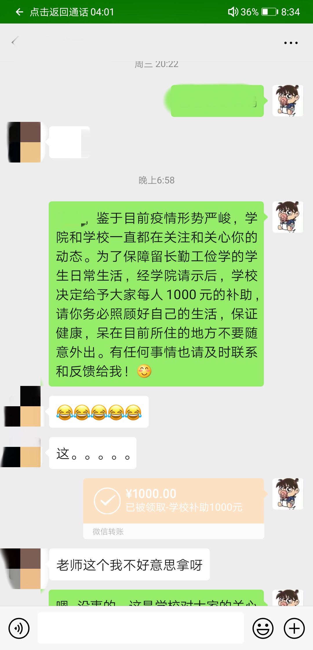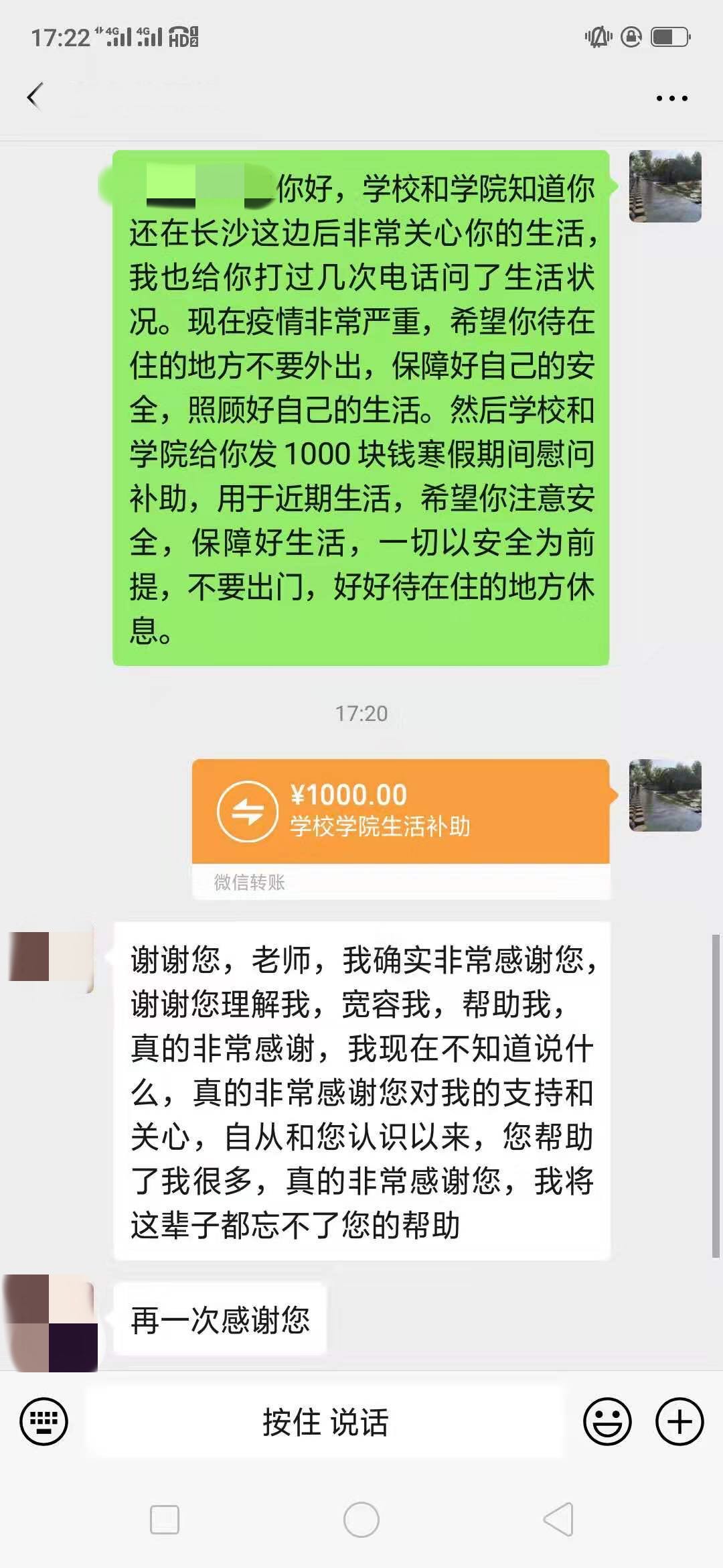 大年初二,学院通过对全体学生的地毯式排查了解到有4名少数民族学生和1名延长学制学生因家庭经济困难等原因留在长沙兼职打工。突如其来的疫情中断了他们的兼职计划,无法及时返家,生活经济来源也成问题。核实情况后,辅导员綦丽、董治佑、李小军和地里努尔·肖合拉提第一时间为每位同学转去1000元慰问金,并立刻建立群组每日关心他们的生活与健康状况,确保他们在这个特殊的假期停工后生活有保障,异乡有温情。