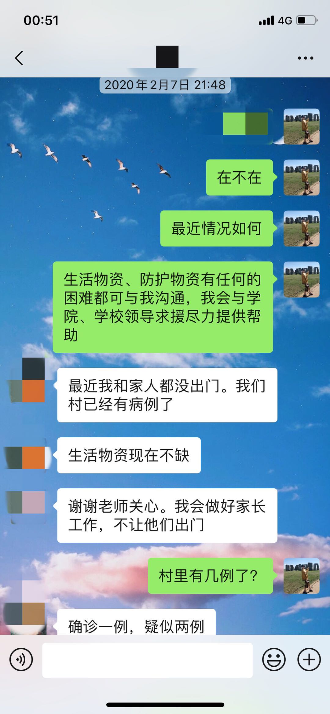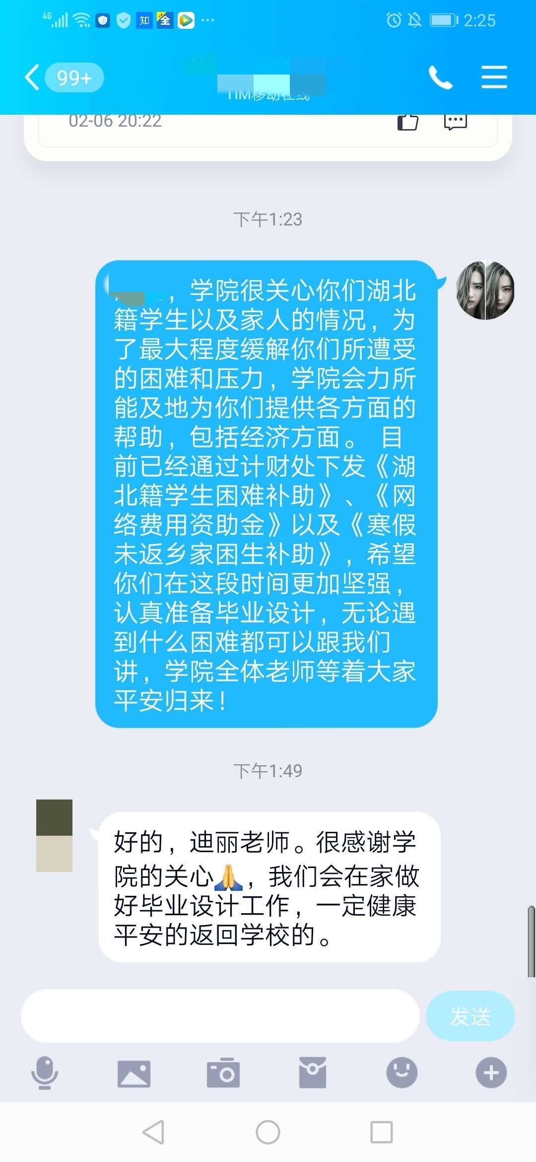 “杨同学好!学院为每位湖北籍家庭经济困难学生发放了1000元慰问金……请你注意查收哦!特殊时期,我们一起共克时艰!在生活、学习等方面有任何困难可随时与我沟通,学校和学院是你的强大后盾。请继续坚守,做好自己和家人的防护工作。期待早日学校平安见!”