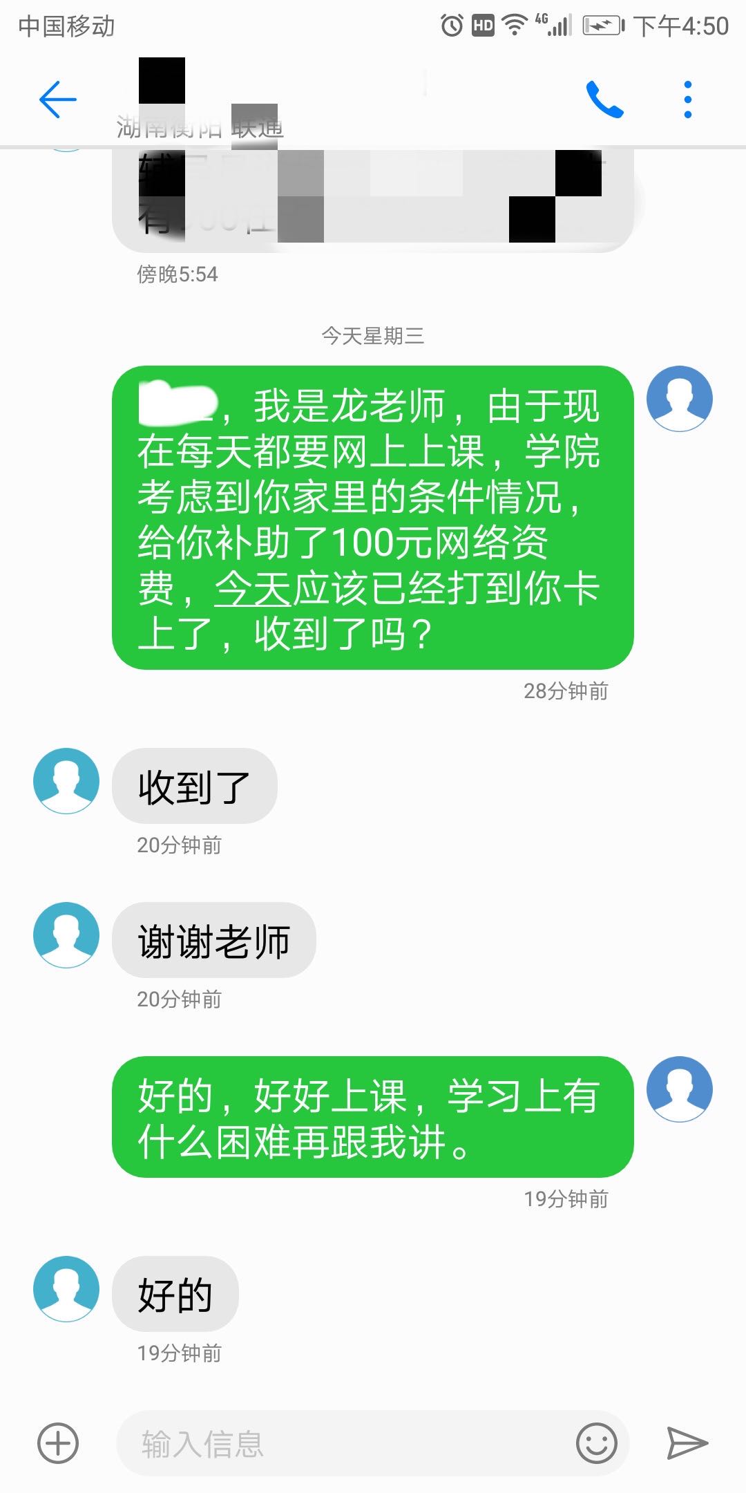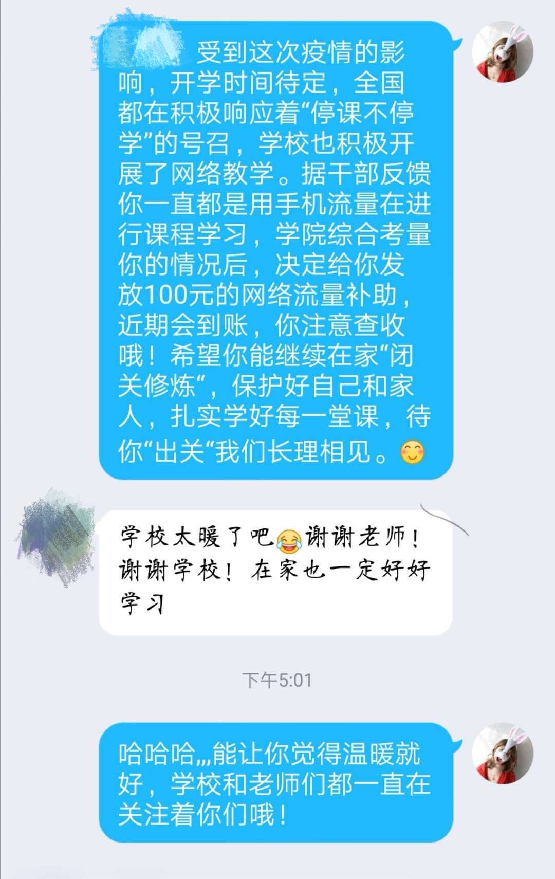 “晓磊,受到这次疫情影响,开学时间待定,全国都在积极响应‘停课不停学’号召,学校也在有条不紊开展网络教学。据了解你一直都是用手机流量在进行课程学习,学院特为你发放100元网络流量补助,确保特殊时期网课有保障……希望你能继续在家‘闭关修炼’,保护好自己和家人,扎实学好每一堂课,待你‘出关’我们长理相见。”