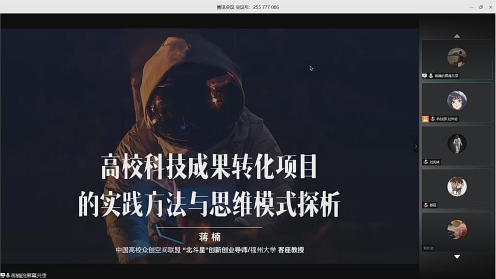 5月16日,土木学院如期举行“双创”训练营名师课堂线上公开课。国高校众创空间联盟“北斗星”创新创业导师蒋楠以“高校科技成果项目转化的实践方法与思维转变”为题授课,学院部分师生参加,本次授课由院党委副书记黄阿明主持。