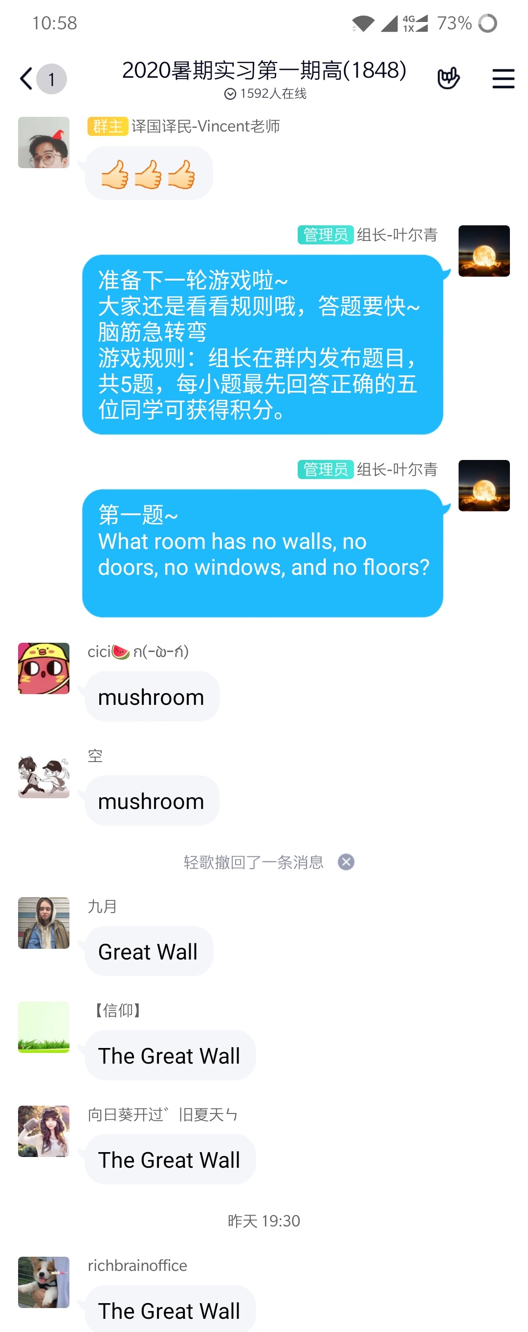 如何有效沟通引导同学完成任务等等都是叶尔青不断学习的内容。他认为在工作中,对任务和活动的了解程度作为有效沟通的前提是十分重要的,友好的态度则是让沟通愉悦顺畅进行的关键。叶尔青和群里另一位组长还组织开展了为期两天的英语游戏活动许多同学积极响应,大家在趣味游戏中放松身心,更好地投入学习中去。很多同学意犹未尽,活动取了极大成功。