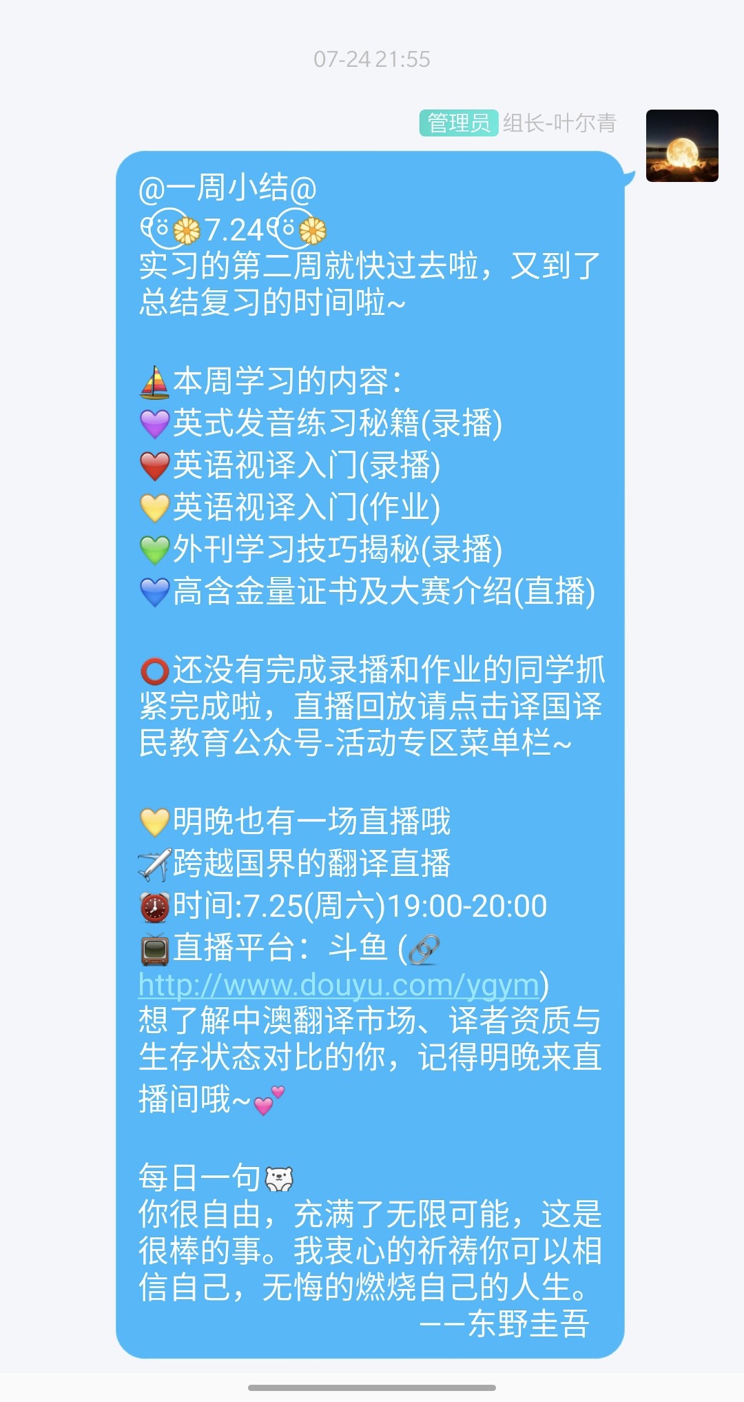 由于2020年暑期处在疫情之中,叶尔青为了丰富生活、锻炼才干,6月初报名参加了全球百强翻译公司译国译民的线上实习课程本着“受教育、长才干、作贡献”的原则,成功当选组长,与另一名组长一同协助老师管理一个接近2000人的实习群。