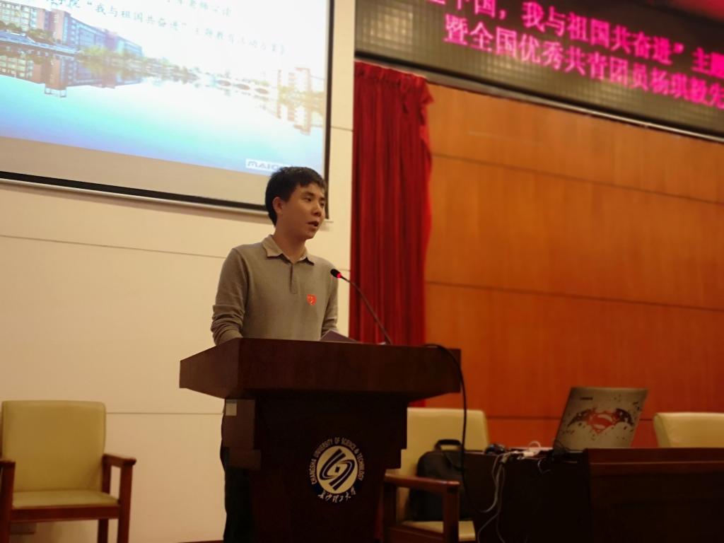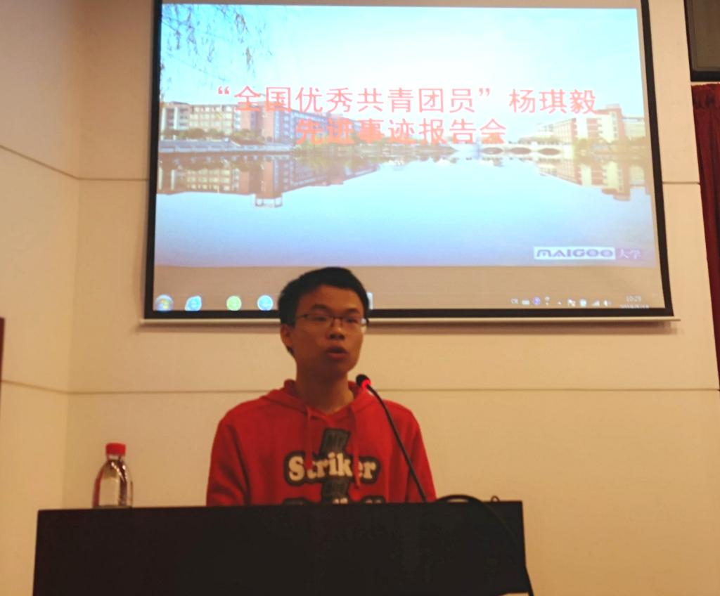 仪式后,举行了全国优秀共青团员杨琪毅先进事迹报告会。他面向全体人员作了题为《矢志艰苦奋斗,擦亮青春底色》的先进事迹报告,从科研、学习和生活三个方面呈现了一名全国优秀共青团员的所思所感。他鼓励大家不能向命运低头,而是要选择逆行;不能轻言放弃,而是要坚守到最后;不能辜负时代,而是要肩负起历史使命,充分利用好大学四年的宝贵时间,多做一些有意义的事情。