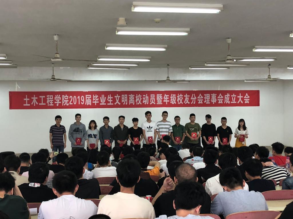 6月13日上午,土木工程学院2019届毕业生文明离校动员暨校友理事会成立大会在工三A201召开。学院党委副书记王煜坤出席,2019届全体毕业生参加大会。会议由毕业生辅导员龙承运主持。