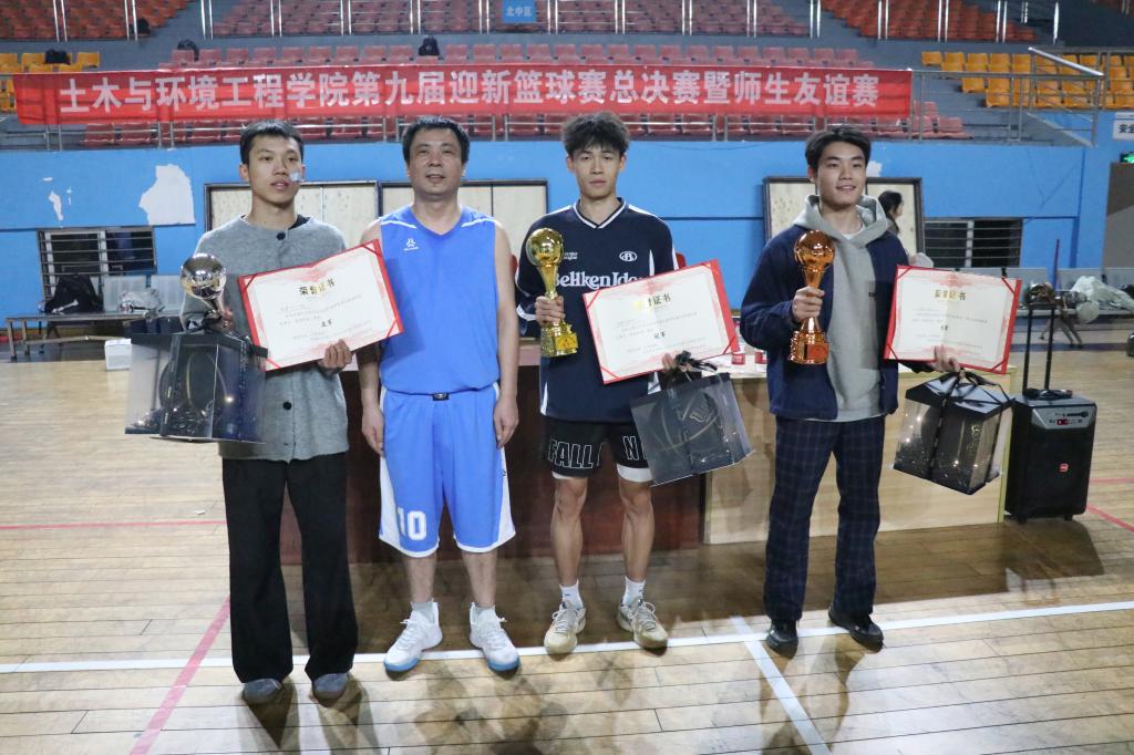 随后师生友谊赛正式开始。师生以篮球为媒介,双方友好交流互动,贴近彼此距离,赛场氛围轻松融洽。比赛结束后,球员与参赛老师握手致谢,学院老师为本次迎新篮球赛获奖队伍颁奖。