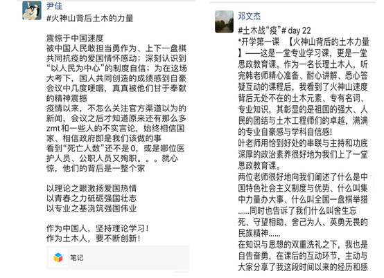 “震撼、感动、自豪、骄傲、超燃”成了这一课堂反馈的高频词汇,很多学生家长都成为这堂课的旁听生。“我太喜欢这堂课了!作为中国人,坚持理论学习!”“我看到了火神山速度背后无处不在的土木元素、专有名词、专业知识,其彰显的是祖国的强大、人民的团结与土木工程师们的卓越,满满的专业自豪感与学科自信感!”不少同学课后在朋友圈记录下自己的心情。肖勇刚教授2月28日为毕业生开讲第一课后,岩土1602班阳吉首就留言感慨:说的我热血沸腾,只想去工作了。