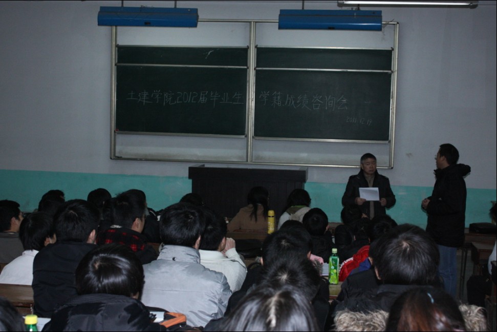 12月19日下午4:30,土木与建筑学院在金盆岭校区3教115教室召开了2012届毕业生学籍与成绩咨询会,教务办王红老师、学工办肖寒老师及相关毕业生参加会议。