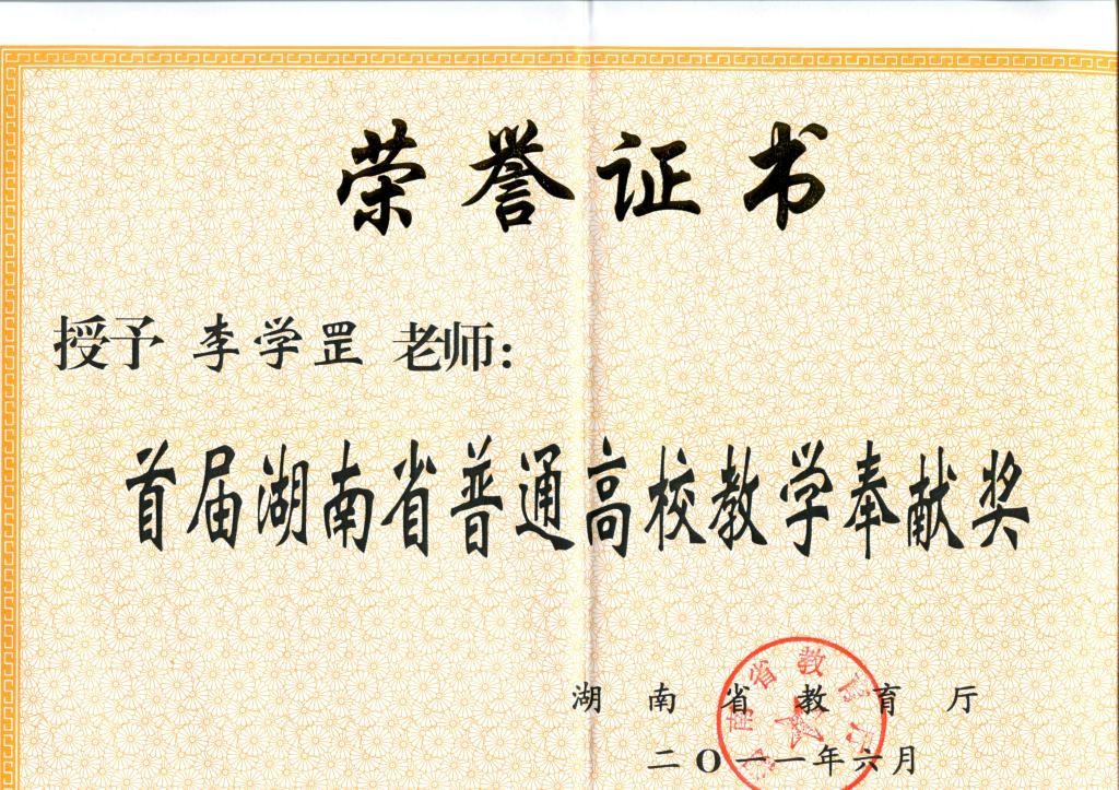湖南省教育厅湘教通【2011】333号《关于表彰首届湖南省普通高校教学奉献奖获奖教师的通报》,我院李学罡老师荣获首届湖南省普通高校教学奉献奖,受到表彰。我们向他表示祝贺!