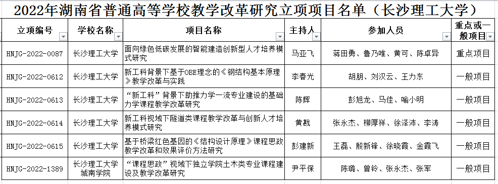 根据《湖南省普通高等学校教学改革研究项目管理办法》(湘教发〔2021〕23号)和《关于开展2022年湖南省普通高等学校教学改革研究项目立项和结题工作的通知》(湘教通〔2022〕79号)等文件要求,经学校推荐申报、专家评审、教育厅审核,土木工程学院2022年全省普通高校教学改革研究项目立项6项(其中重点项目1项、一般项目5项)