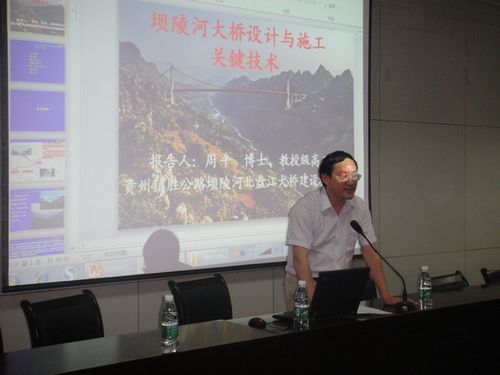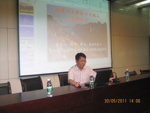 周博士曾担任贵州镇胜公路坝陵河、北盘江大桥建设指挥部副指挥长,现任贵州杭瑞高速贵州境毕节至都格段项目建设办公室主任,他首先播放了坝陵河大桥的建设全过程的三维施工动画,在座的各位师生都被精美的动画所吸引。接着,他对该桥的建设条件、主桥总体设计进行了总体介绍。然后,针对工程中的一些关键技术及创新点进行了详细地讲解,如坝陵河大桥的主塔及重力式锚碇施工、世界级隧道锚碇施工、国内首次在超千米悬索桥上使用飞艇牵引先导索法、全回转全液压桥面吊机架设钢桁加劲梁架设及其关键技术等。最后,周研究员对在座师生提出的问题做了精彩的回答,受到了师生的好评。