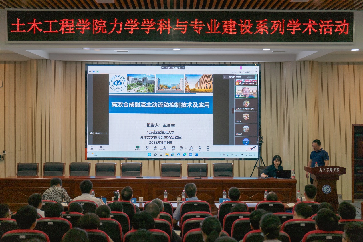8月9日上午9时,在我校工程力学国家一流专业与力学学科建设发展研讨会上,国家杰出青年科学基金获得者、教育部“长江学者”特聘教授、国家自然科学基金创新研究群体学术带头人、北京航空航天大学航空科学与工程学院王晋军教授应邀作了题为《高效合成射流主动控制技术及应用》的学术报告。报告由土木工程学院副院长韩艳教授主持,土木工程学院院长王磊教授、哈尔滨工业大学王超教授、力学系全体教师和100余位研究生线下参加了此次报告,部分专家、学者线上聆听了此次报告。
