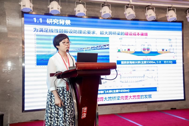 韩艳教授在主题报告中介绍了风致颤振对桥梁结构的危害,阐述了发展非线性桥梁颤振理论和基于时域分析的桥梁颤振评估方法的重要性,介绍了其团队在大跨度桥梁颤振研究方面取得的进展和成果。