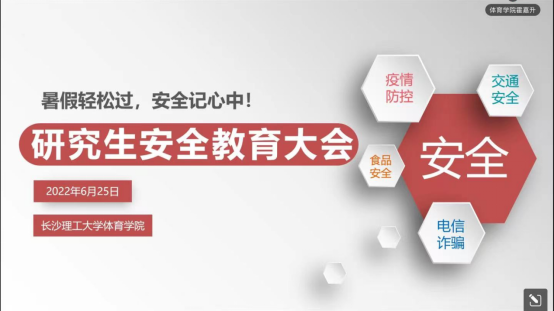 2022年6月25日下午17:00,体育学院召开研究生安全教育线上主题班会,本次班会主题为“暑假轻松过,安全记心中”,由体育学院2021级研究生班主任霍嘉升主持,全体研究生参加本次会议。