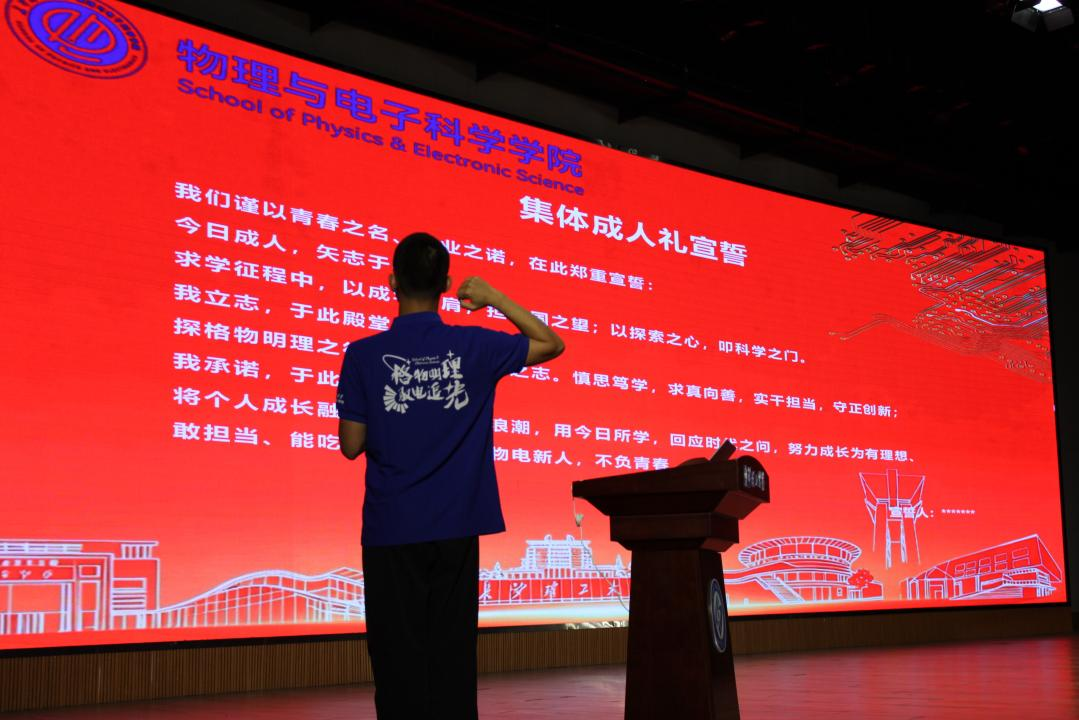 典礼最后,全体新生进行了集体成人礼宣誓,铿锵有力的誓言回荡在礼堂上空,展现了物电新生昂扬的精神风貌和坚定的理想信念。此次开学典礼不仅是一场欢迎仪式,更是一堂生动的"开学第一课",为2025级新生的大学生活指明了方向,注入了动力。新生们将在这里扬帆起航,追寻科学之光,书写青春篇章。
