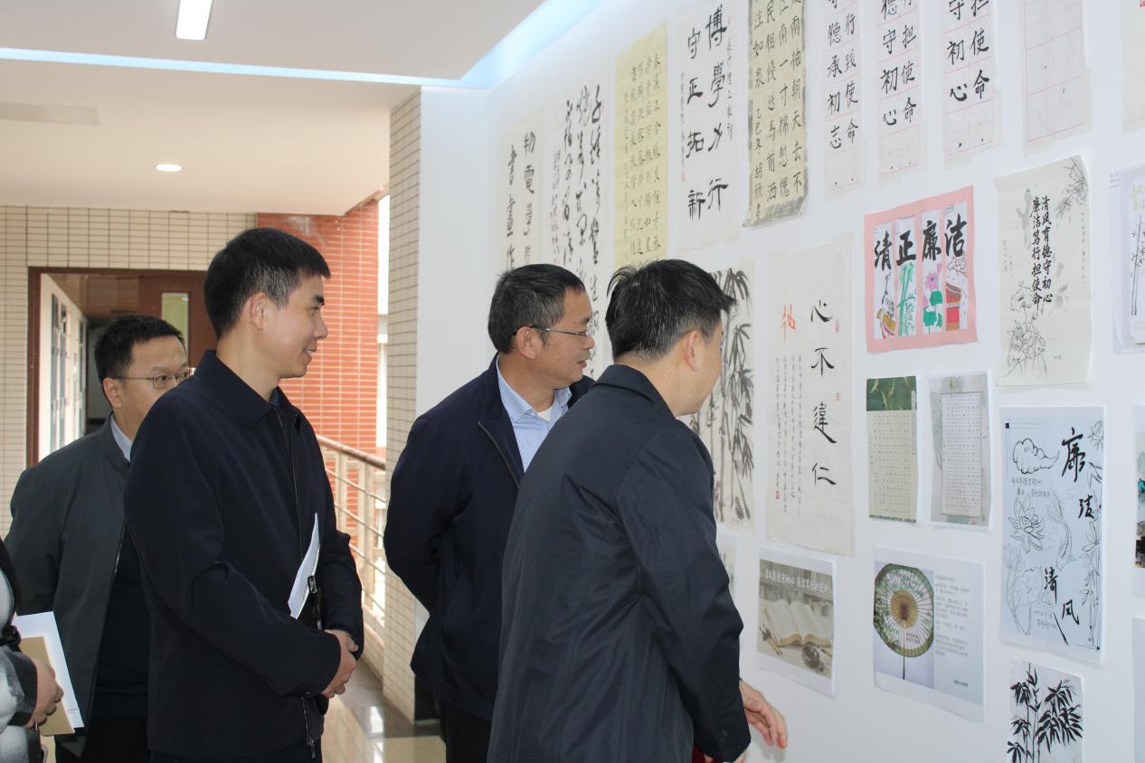 会前王副组长一行兴致勃勃地参观了“物电学院廉政文化师生书画展”并对学院举办此次活动给予高度肯定。