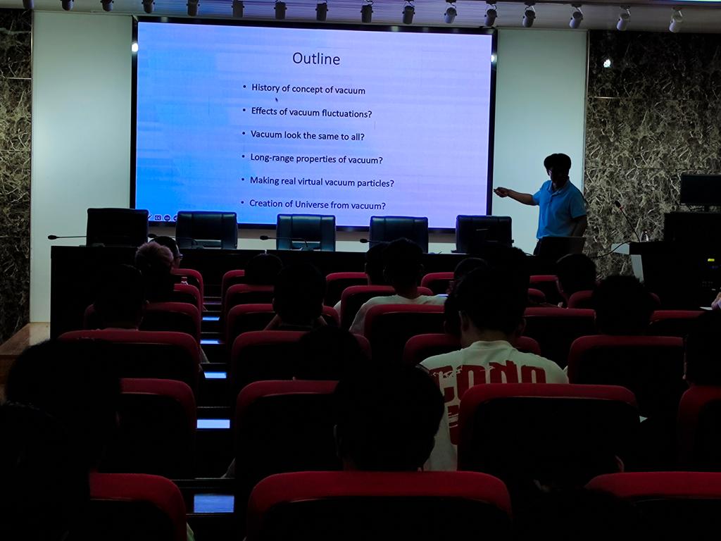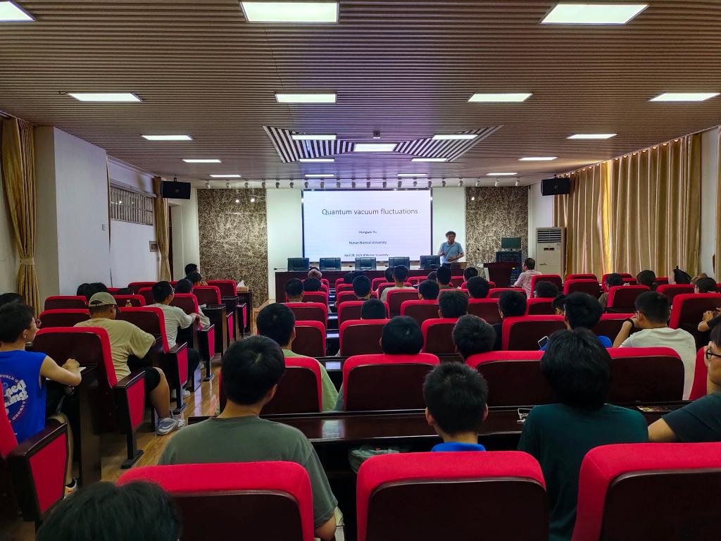 5月29日下午湖南师范大学余洪伟教授应邀来我校理科楼B413作了一场题目为“Detecting acceleration-modified vacuum fluctuations (Unruh effect) with quantum entanglement”的学术报告。学院物理专业教师和研究生、本科生共一百余人现场聆听报告,副院长(主持工作)张卫兵主持报告会。