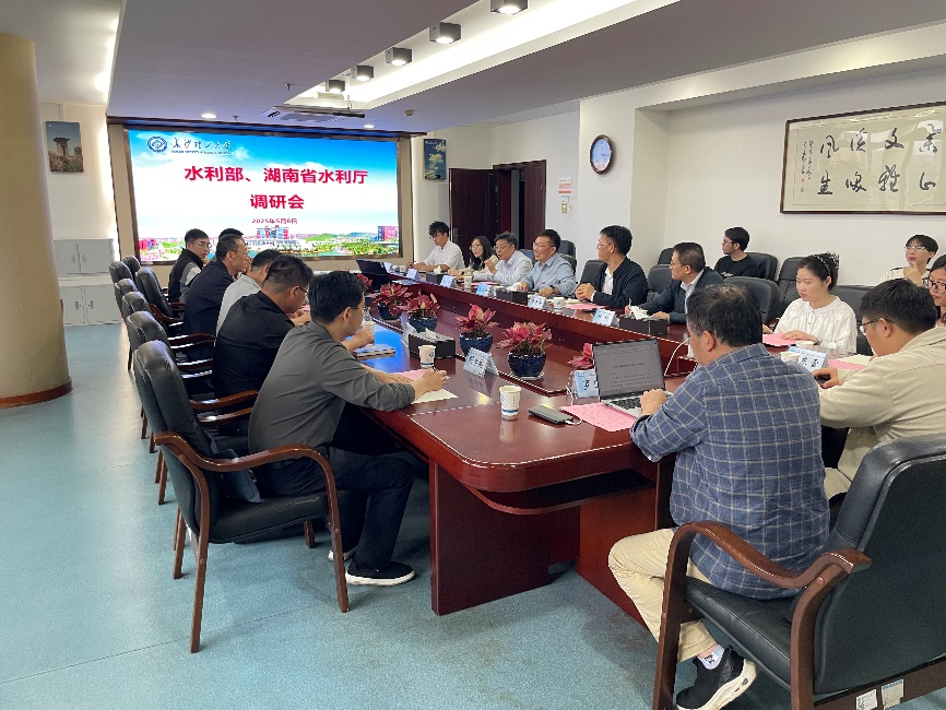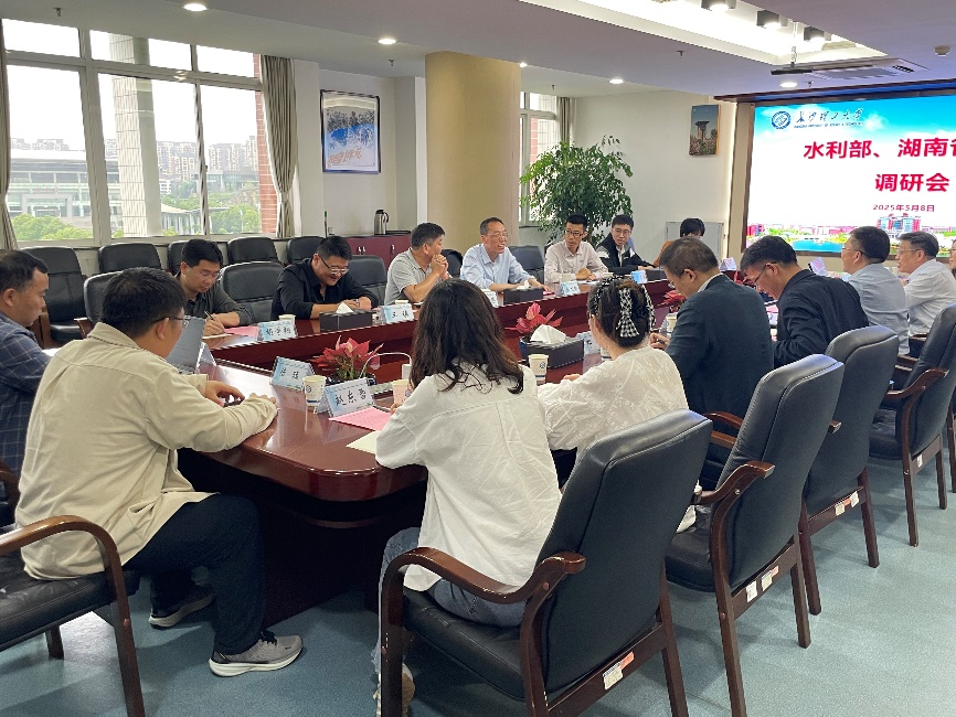 5 月 8 日下午,水利部水土保持监测中心主任张文聪率队调研我校全国人为水土流失智能提取模型研发与应用情况,湖南省水利厅二级巡视员朱健荣陪同调研。校党委委员、副校长张军辉出席调研会,物理与电子科学学院院长邓科、智能感知与检测技术团队骨干教师和研究生参与调研会。会议由校科技处副处长卿志和主持。