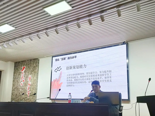 培训伊始,齐铁钧老师结合自己的省学联工作经历,介绍了学联二十七大的定义,宗旨和六个基本任务等。接着齐铁钧老师着重强调了学生会工作所遇到的问题和解决方法,首先从老师,同学和自身三个方面分析高校学生干部存在的不足与原因,并提出详尽的解决办法,第一,养成勿忘初心,将心比心,耐心恒心,三心优秀品质;第二,锤炼四种工作作风:锤炼谦虚谨慎,艰苦奋斗,脚踏实地,客观公正的工作作风,一定要将工作落实到学生自身;第三,强化能力水平:强化组织动员能力,创新策划能力,心理调试能力,统筹协调能力,人际交往能力,既要把工作做好,也要在学习上起带头作用。培训尾声,齐铁钧老师总结了“忠恕任事”四个字,希望学生干部要担得起责任,发挥表率作用,要将学生的声音传递给学校,要将学生的要求落实到实处,要让学生感受到温暖,这样学生会的工作才是成功的。