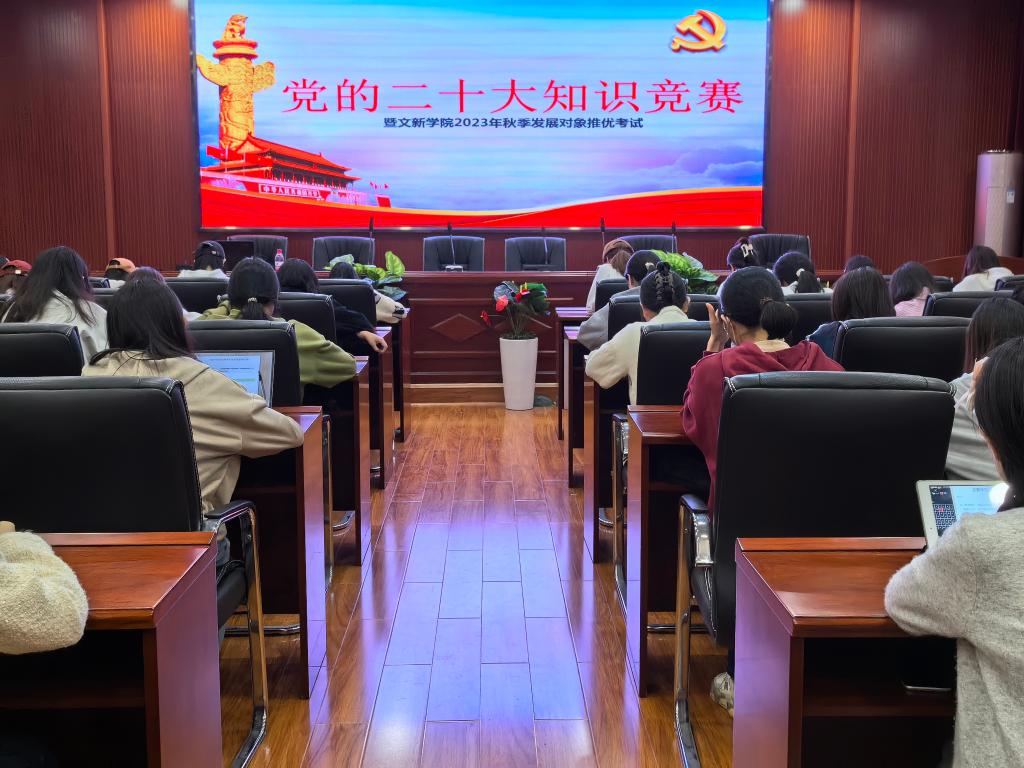 为深入落实并贯彻落实党的二十大精神,积极探索“互联网+党建”的新模式,进一步提升入党积极分子的理论知识能力水平,10月19日19时,“党的二十大知识竞赛暨文新学院2023年秋季发展对象推优考试”于我校金盆岭校区九号教学楼218室成功举行。