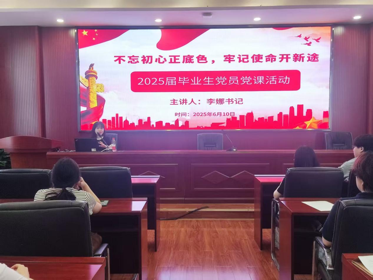为进一步加强毕业生党员党性教育和党纪教育,激励他们坚定理想信念,牢记党员责任,6月10日下午,2025年新澳门原料网站文学与新闻传播学院在金盆岭校区9号教学楼218教室举行2025届毕业生党员党课活动,2025届全体毕业生党员参会,学院党委副书记(主持工作)李娜以《不忘初心正底色,牢记使命开新途》为题,为全体毕业生党员上专题党课。