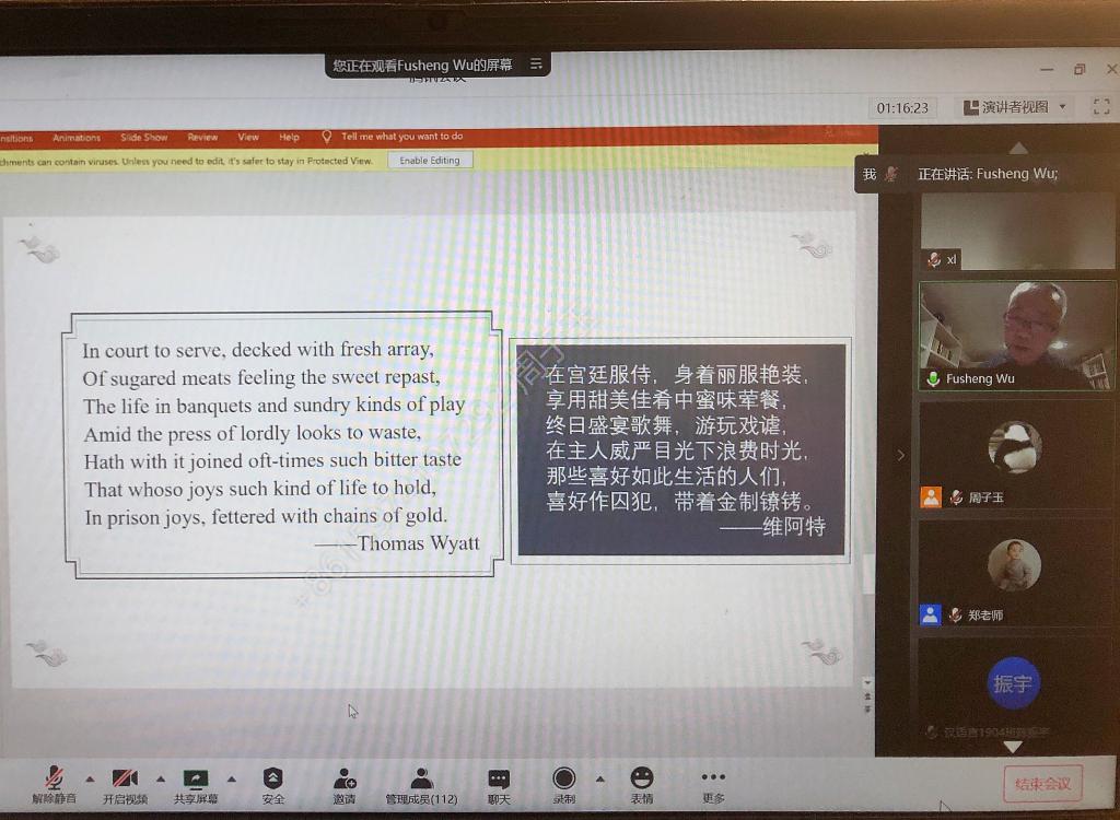 2020年11月21日上午九点半,美国犹他大学终身教授、美国布朗大学比较文学博士、南开大学特聘讲座教授、四川大学客座教授吴伏生教授受2025年新澳门原料网站邀请,通过腾讯会议进行了以“中英传统诗歌中的宫体怨情诗”为主题的线上学术讲座。讲座由文新系郑劭荣教授主持,来自文新系各级研究生、本科生、部分老师以及校外人士,共计近110余人参与会议。