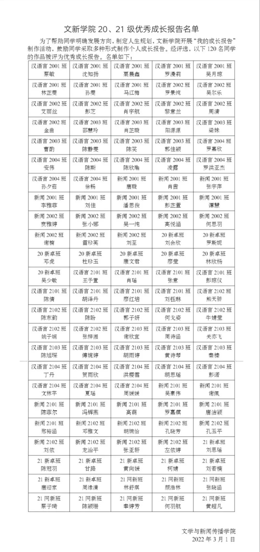 为充分调动同学们总结过去、展望未来的积极性,更好地发挥“阳光启航”班会的作用,营造良好的创作氛围,文新学院于寒假期间面向所有大一大二新生举办“我的成长报告”制作活动,经过评委评审,共评选出120份优秀成长报告并发放奖品。