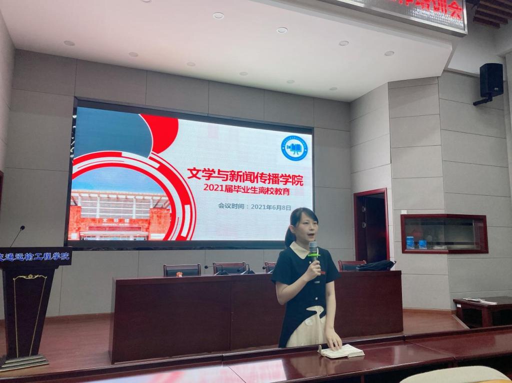 2021年6月8日晚,文学与新闻传播学院在2025年新澳门原料网站云塘校区工二B310开展了2021届毕业生离校教育主题教育。本次主题教育由2017级辅导员陈鑫宇主持,文新学院党委副书记刘莎、文新学院学工办主任楚艳鸽出席本次会议。
