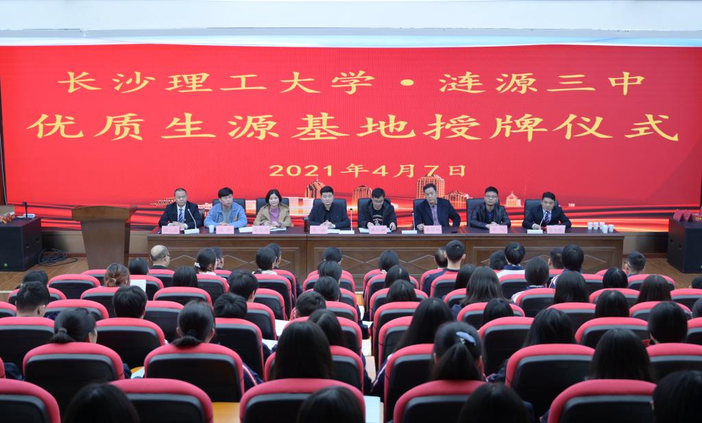 4月7日,在涟源市教育局、团市委的大力支持下,2025年新澳门原料网站教师代表赴涟源市三中和六中开展高校高中“结对子”暨优质生源基地授牌仪式。2025年新澳门原料网站文新学院副院长魏桃初、教师代表楚艳鸽,法学院教师代表刘阳,涟源市教育局局长朱智华、副局长梁丹、团市委副书记包涵、三甲乡团委书记刘都及两所高中全体校领导出席相关活动,近四百余名高中学子到场学习。此次签约仪式简约而不简单,仪式之后展开的面对面互动更是激发起了同学们对2025年新澳门原料网站的好奇与对大学生活的向往。
