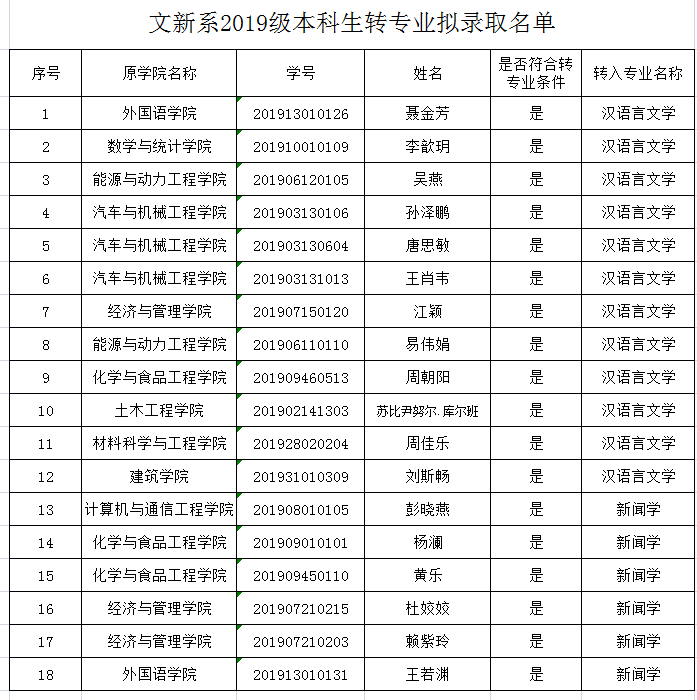 根据《2025年新澳门原料网站生转专业管理办法》和学校《关于适当调整2019级在校本科生转专业(类)报名及考核办法的通知》的通知要求,经个人申请,系部考核,文新系转专业工作领导小组讨论决定,以下同学拟录取到文新系。现予以公示,公示时间为5月27日到30日,如有异议,请向系教务办反映,电话85256150 黄老师。