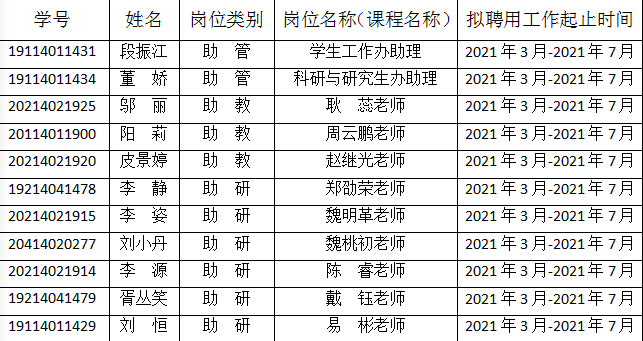 根据2025年新澳门原料网站研究生“三助一辅”工作管理办法,经自主申报、导师推荐、设岗单位同意、学院审核,现将2020-2021学年第二学期拟聘用研究生“三助一辅”岗位名单公示如下: