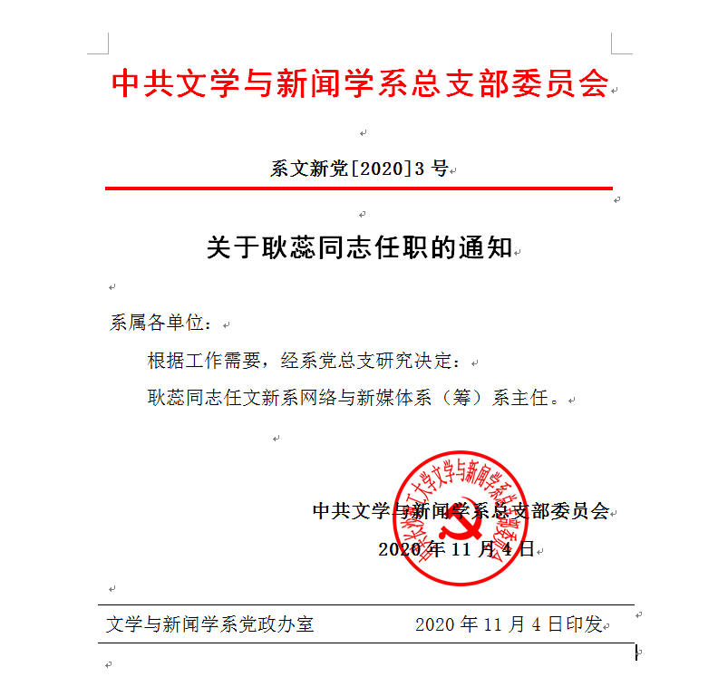 关于耿蕊同志任职的通知