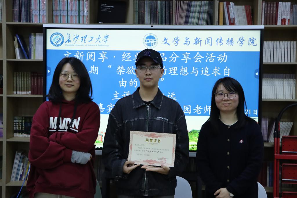 活动最后,黄楚蓉老师与吴梦园老师为张文远颁发“优秀主讲人”证书,并与参与者合影留念。此次分享会为同学们提供了一个交流与思考的平台,有助于激发同学们对于经典作品的创新性思考,同时联系现实生活,助力解决生活中的疑难问题。